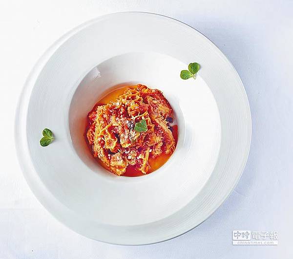 羅馬式燉牛肚 360元選用澳洲牛的牛肚部位,先用洋蔥、紅蘿蔔、芹菜燉煮牛肚2小時去腥,再續燉1~2小時的功夫菜。料理本身偏辣,撒上羊奶起司再烤,風味特殊,加了薄荷葉後,有一種清香,同時可解膩