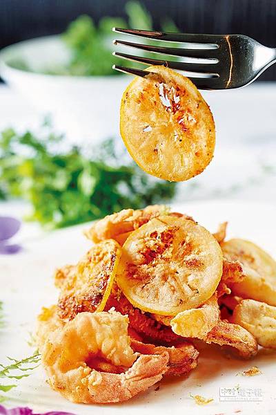 酥炸海鮮 360元選用基隆崁仔頂新鮮海鮮沾義大利杜蘭麥粉油炸,特色是加入新鮮黃檸檬片同炸,撒上綠檸檬皮,增添香氣,口感不油膩,清爽開胃,因加入匈牙利胡椒粉,口感帶辣