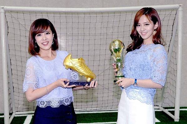 朱培滋(左)和房業涵開心捧世足金杯等紀念物拍照。圖/華視提供