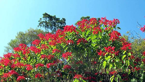 最近在山間常看到被棄置多年的聖誔紅,當年節後紅葉不再,很多人家就當垃圾抛棄。有些有心人特地把到郊山挖個洞讓它自生自滅,誰知隨著時間過去竟長的非常茂盛。聖誔紅不像一般的樹長成高大的一棵,年年分枝讓它成樹叢,一大片紅花綠葉很漂亮,也很壯觀。野放後聖誔紅的模樣和印象中的紅色小盆栽有著不同的味道。