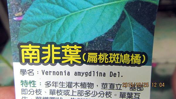 南非葉原名桃葉斑鳩菊,英文:Bitter Leaf;學名:Vernonia amygdalina Delile。科別:菊科。有一大堆別名:扁桃斑鳩菊、杏葉斑鳩菊、斑鳩菊、尖尾鳳、肝連、苦樹、苦茶葉、苦膽葉、苦葉樹、苦葉、神奇葉、巴西國寶。