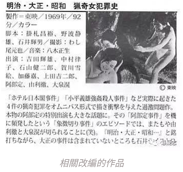 2.阿部定事件:女侍阿部定(賀川雪絵飾)與主人石田吉藏(若杉英二飾)深深相戀,情到濃時,竟不惜掐死對方,並割下愛人陽物隨身攜帶。