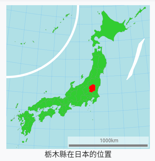 老頭註:栃木縣(とちぎけん)是日本關東北部的一個內陸縣。東面連接茨城縣、西面為群馬縣、南面為埼玉縣、北面鄰接福島縣。縣政府所在地為宇都宮市。「栃」是日人自創漢字(和字) ,意指日本七葉樹,中文應該讀如「櫔」。栃木縣與群馬縣在古代是「毛野國」的一部份。仁德天皇時,分為「上毛野國」和「下毛野國」。奈良時代改稱「上野國(如今的群馬縣)」、「下野國」(如今的栃木縣)。栃木縣面積約6,408.28平方公里,在日本全國排名第20位,2012年總人口 1,994,199人。栃木縣東西距離約84公里、南北距離約98公里。縣都宇都宮市距離東京約100公里、從東京站乘搭東北新幹線至宇都宮市約需50分鐘。縣內的日光市為日本著名的觀光勝地。