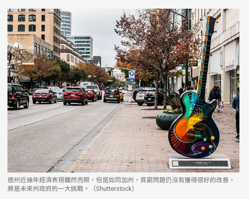 德州近幾年經濟表現雖然亮眼,但是如同加州,貧窮問題仍沒有獲得很好的改善,將是未來州政府的一大挑戰。