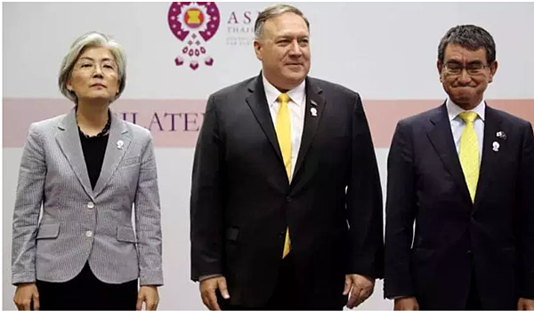就在上個禮拜五,東盟外長會議正好在泰國召開。日韓兩國的外交部長在美國的撮合下強行坐到一起,試圖談一談韓國被日本踢出白名單的事兒。可是日本並沒有給美國人面子,兩國的外交部長尷尬地深情對望,最後不歡而散,回到賓館睡覺前還各自表態說了狠話,美國的斡旋算是徹底失敗。