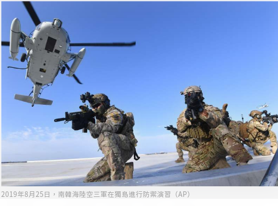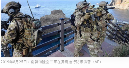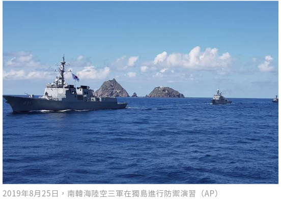 南韓與日本原已緊繃的關係25日更見惡化,南韓國防部當天宣布,25、26日兩天在兩國有主權爭議的「獨島」(日本稱竹島)進行軍事演習,彰顯堅定守護東海(日本海)領土的決心,因此命名為「東海領土守護演習」。日方則重申「竹島是日本固有領土」,並對南韓舉動「極為遺憾,強烈要求停止演習。」