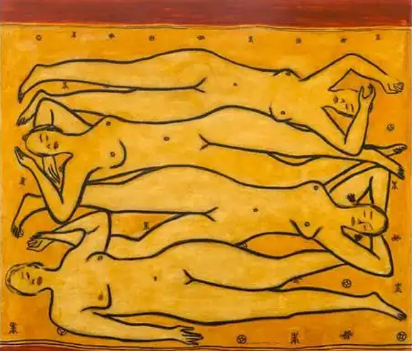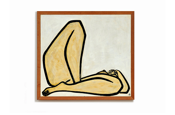 「曲腿裸女」以奇特視覺呈現的畫面。畫中裸女躺在純白色的抽象背景中以水平躺臥,雙腿一橫一豎屈曲交叠,最異乎尋常的,是藝術家採用從底下往上看的方式,特寫放大了裸女的下半身與私密部位,上半身僅以臉部和胸部作壘疊式露出,並支出左臂,可說藝術家借助了誇張變形的裸女身姿,聯繫到東方山水奇石的造型。