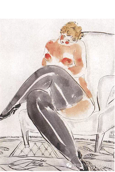 沙發椅上穿黑絲襪的裸女”1920-1930年代。水彩紙本。徐志摩在與友人的信中稱常玉的裸女畫有一雙“宇宙大腿”