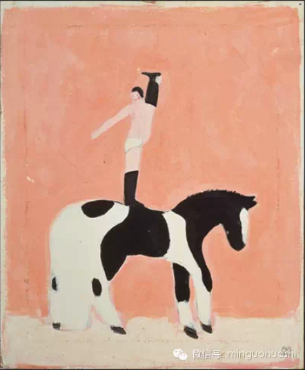 “馬上英雄”1930年代油畫紙本裱於木板。常玉早期的作品,受巴黎浪漫情調的影響,畫面大都由白、粉紅、赭黃等淺色塊構成主調並且運用書法性的線條,傳達出愉悅的情感
