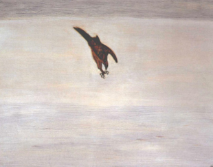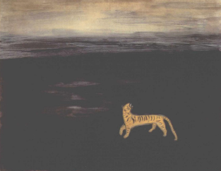 天地雖大,幾無容身之所。小像在畫面上變得很小,像被從天上扔下來一樣躺臥在深色的原野中,彷彿馬上就要被世界消解融化。