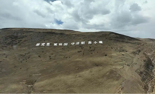 前往稻城亞丁路途上刻在山體的黨國標語。圖/廖文綺
