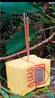 祭拜用的線香上,除了出現鬼魂化身的「螽斯」駐留外,冥紙上也出現鬼臉(黑圈處)
