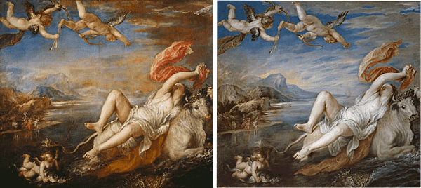 左【圖 3】Titian, The Rape of Europa, 1560/2. Oil on canvas, 178×205cm. Isabella Stewart Gardner Museum. 右【圖 4】Peter Paul Rubens,The Rape of Europa(after Titian), 1628/9. Oil on canvas, 182×201cm. Museo Nacional del Prado.