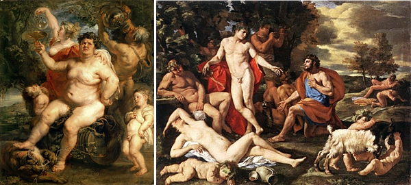比較魯本斯與普桑(Nicolas Poussin, 1594-1665)的酒神,普桑作品〈米達斯與巴克斯〉(Midas and Bacchus, 1629/30) 【圖8】,整體呈現和諧的畫面,頭戴著葡萄藤拿著酒杯的巴克斯一副泰然的樣子,如古典雕刻般的倚在石台上,身形完全是古典美男子的模板。對照魯本斯的〈巴克斯〉,畫中的人物肌膚佈滿著不規則的皮下脂肪,呼應著擾動的背景,這樣的筆觸更增添一股動態的生機,觀者彷彿無意間闖入了一個酒吧包廂,撞見裡頭的人正亂哄哄喧鬧著的一瞬間。位在畫面中心的酒神,則是一個肥胖又醉醺醺的中年大叔,看起來已經對派對生活產生職業倦怠,又因為酒喝太多呈現一副橫肉四溢的體態。但相較早先〈喝醉的西勒努斯〉(The Drunken Silenus, 1616/17)【圖6】,減少許多警惕的意味。