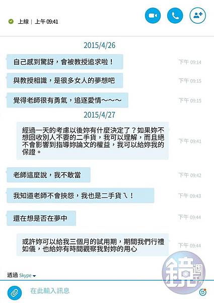 陳女還用意外的口吻問教授:「自己感到驚訝,會被教授追求啦!」「與教授相識,是很多女人的夢想吧。」「覺得老師很有勇氣,追逐愛情…」陳世宗隨即反問:「經過一天的考慮以後,妳有什麼決定了?如果妳不想回收別人不要的二手貨,我可以理解,而且絕不會影響到指導妳論文的權益,我可以給妳我的保證。」