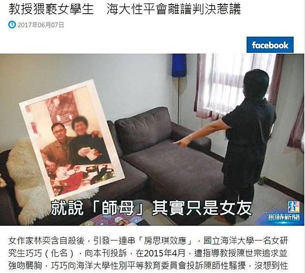 海大碩士生陳麗娜3年前指控遭指導教授陳世宗強吻襲胸,結果案情大逆轉,陳世宗舉證錄音證明清白,陳麗娜被碰到胸部還問:「感覺怎麼樣?」最近反吃上誣告罪及誹謗罪遭判刑。
