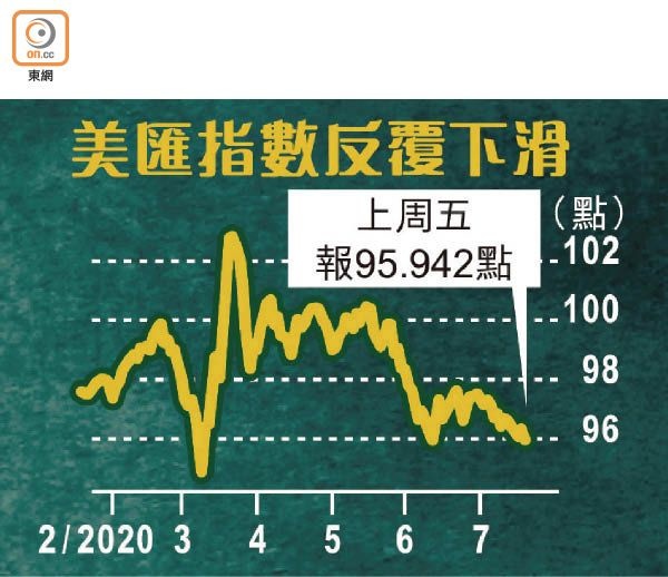 由於外界對美元及美元資產需求減弱,以及美國經濟復甦情況相對較差,疫情威脅仍未解除,經濟基本面對美元的支撐作用下降,令美元信用持續受損,一再削弱國際市場對美元的信心,美元兌世界各主要貨幣全線下跌。美元指數已由今年3月的高位近103點,大幅貶值至失守94點(7月29日),不但是兩年以來新低,而且跌勢未止,令外界對美元結構性貶值的憂慮加大,衝擊了美元作為國際主要貨幣的霸權地位。
