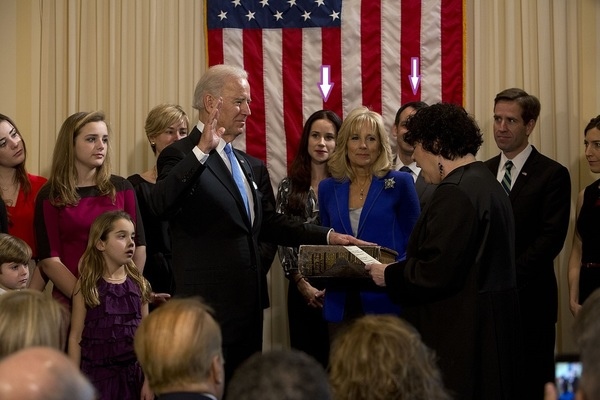 拜登(左三舉手者)2013年1月宣誓就任美國副總統時,女兒愛希莉、女婿克萊恩(箭頭處)都到場觀禮