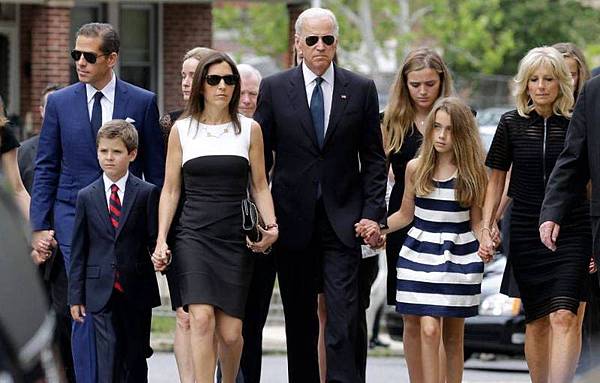 2015年時任副總統的喬.拜登與家族成員一起出席長子博.拜登喪禮。喬.拜登(前排中)、次子杭特(後排左)與長媳賀莉(前排左2)、賀莉的女兒娜塔麗(前排身穿黑色橫條紋洋裝)及吉爾.拜登(前排右2)