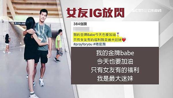 楊俊瀚在世大運前夕自稱單身,但世大運期間女友Rita貼出兩人摟抱合照宣示主權,還甜蜜稱呼楊俊瀚是「金牌babe」