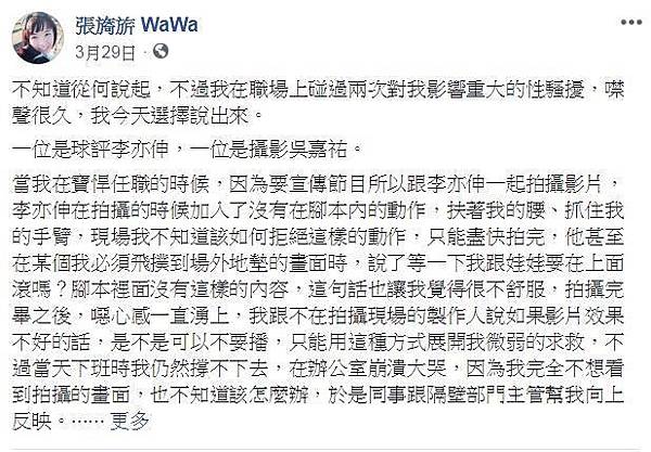 另外張旖旂也指控前公司的吳姓攝影,曾對她做出逾矩行為,「他在工作時不只一次撥我的頭髮,甚至摸過我的臉,這些行為發生在球場,用很正當的理由,頭髮有東西、頭髮亂了,讓我來不及反應。」可見張旖旂響應好萊塢#MeToo運動,決定將自己的經歷說出。