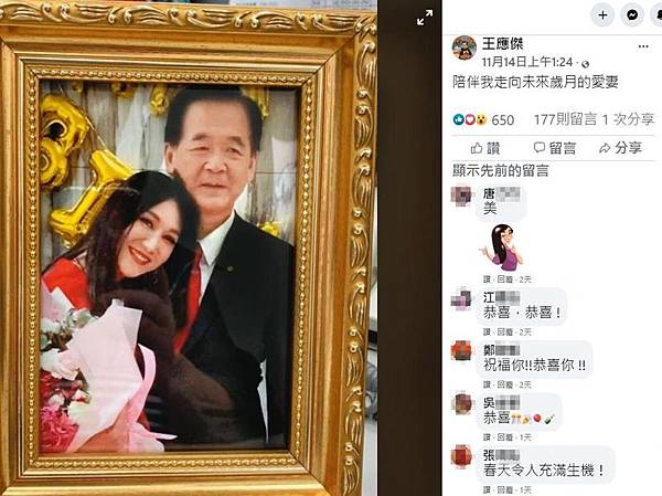 本(11)月初,知名藝人林心如幫父親在君品酒店舉辦70歲壽宴,不只台上星光熠熠,台下也是冠蓋雲集,身為客運業大老的中佳電力董事長王應傑應邀參加,逢人就介紹身旁的美女:「這是我太太。」說著,原本直挺的腰桿又高了幾分,臉上滿是驕傲,多位商界大老闆當場誇他好福氣,言語間不乏幾分羨慕;10天後,王應傑在臉書放上一張與美女的合照,上面寫著:「陪伴我走向未來歲月的愛妻。」大方示愛。
