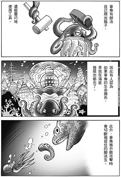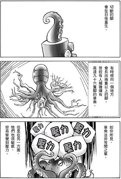 前頁的漫畫已經提到章魚是對壓力非常敏感的生物。那不用說即知,為了生存下去,牠們想必擁有各式各樣的「武器」。