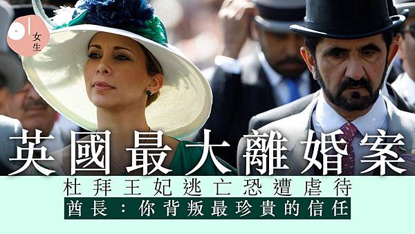 去年身家坐擁逾港元1,000億的杜拜酋長穆罕默德(Sheikh Mohammed Bin Rashid al-Maktoum)的妻子哈雅王妃(Haya Bint al-Hussein)竟帶同兩名子女與3,100萬英鎊(約港元3億)前往英國尋求政府庇護。哈雅王妃同時向當地高等法院申請強迫婚姻保護令及禁止騷擾令,傳媒更形容杜拜酋長與哈雅王妃的案件是「英國最大離婚案」之一,事發經過也成網民口中常形容的「狗血愛情」連續劇的表表者。