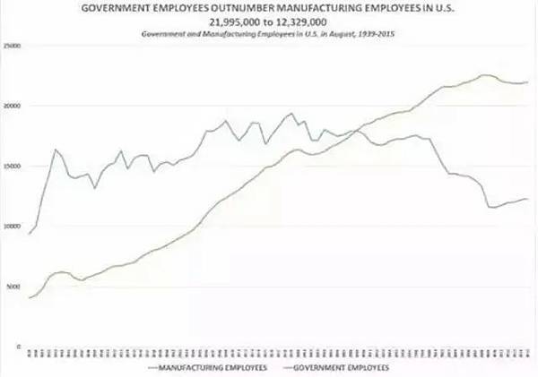 美國政府僱員是2,199萬5,000人,佔總就業人口的15%。美國製造業人口1,232萬9,000人,基本上一個工人養兩個體制內。