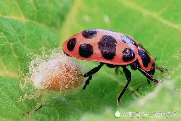 綠眼黃蜂的獵物是比自己個頭大一號的瓢蟲。她找到倒霉的瓢蟲後,把尾針插進瓢蟲的肚皮里,產下一枚蟲卵。幾天後蟲卵在瓢蟲體內孵化成幼蟲,幼蟲美滋滋地啃食著瓢蟲的內臟,一天天長大。20天后,胖乎乎的幼蟲咬破瓢蟲的肚皮鑽出來。不過此時的幼蟲還捨不得離開它的糧倉宿主,鑽出後她爬到瓢蟲身體下面,在六條蟲腿之間結了一個繭,躲在繭裡等著羽化變形。