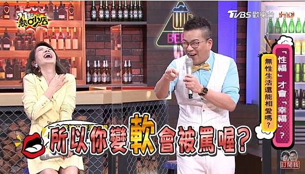 但黃育仁解釋,只是因為自己處女座一做事就拚命拚到底的個性,希望至少經濟上不要讓老婆有後顧之憂,因此很努力在工作。會逃避對方尋歡,其實是擔心自己表現不好,就覺得乾脆不要,他還透露某天勉強做,「但做一做感覺快融化了,硬度會減低,就覺得又要被罵!」一旁的主持人沈玉琳驚呼「壓力這麼大,變軟會被罵喔?」黃育仁急忙解釋後來有隻貓跳到自己背上,老婆還替他找台階下,說是被貓嚇到所以才硬度減低,讓全場笑翻。