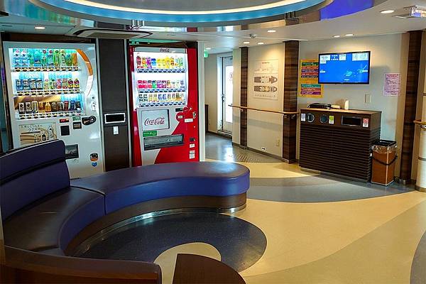 這是日本的邊境了,且船票又便宜,我本來還擔心船內環境會不會不太好,但這是白擔心了。郵輪內部非常寬廣舒適,除了座椅外尚有可以躺平的和室,以及備有床鋪的客艙,可以自行選擇喜歡的地方休息。大廳還有沙發椅以及自動販賣機,船艙外有圓桌席,可以悠然眺望海景。當然沒有國際郵輪豪華,但僅四個多小時的船旅,這樣的設備也夠了。船體頗大,可容納120位旅客,但這天旅客僅十幾人,其中許多是高齡人口。