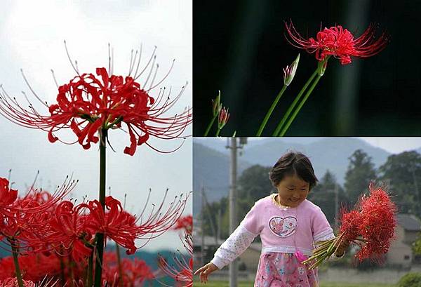 雖說石蒜鱗莖有毒,瞧上頭右下圖(摘自維基百科)中日本小女孩摘了一把紅花石蒜快樂奔跑,只要不食用應不致中毒.