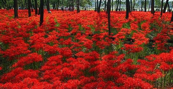 紅花石蒜的花期在秋分前後,恰好碰到日本人的祭禮節日,這時候家家戶戶上墳,然後在上墳途中看到紅花石蒜大量在野外盛放,更加上石蒜鮮紅似血,葉落花才開,花落葉才發,花與葉永不相見,於是乎日本人就認定紅花石蒜是黃泉路上的花了。