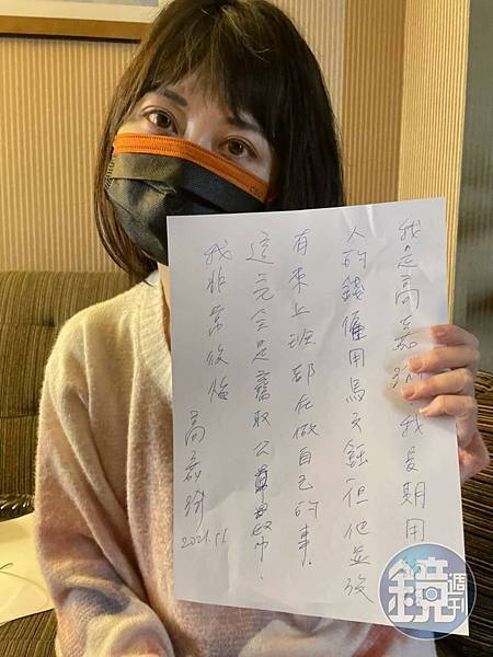 立委高嘉瑜遭恐怖情人林秉樞軟禁在新北板橋的馥都飯店房間內暴打,還遭逼迫簽署一份自白書,內容提及高嘉瑜讓前男友馬文鈺擔任公費助理、坐領乾薪,本刊取得這段全長19秒影片的截圖,高嘉瑜當時奄奄一息,氣若游絲躺在床上,左手仍有明顯長條狀的血痕,明顯處於神智不清的情況,仍被林秉樞逼迫回答,畫面相當驚悚。