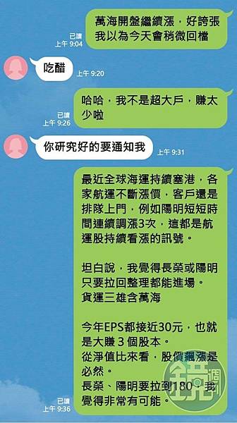 對話中可見二人迅速混熟,S除了要林繼續研究股票,還要他「可以進場告訴我,我可以把手上虧損的去換股。」隨著今年第二季航運股大漲,S貴婦聽從林的建議追買另一檔海運股陽明,跟著賺了一波,讓她對林更加信服,但仍語帶抱怨:「這次你壓(押)對了,我也跟對,可惜太少太晚。」林的投資眼光看似精準,在S獲利了結後,航運股卻還續漲一波。