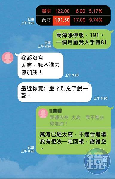 為了炫耀自己與S貴婦搭上線,林還把二人的LINE對話傳給友人,兩人不只聊畫、聊專欄,S貴婦還向林分享醫美資訊,並談到投資股票的話題,抱怨她有多筆股票被套牢,林則大談自己操作航運股獲利豐厚,並向S炫耀自己靠波段操作「航海王」 萬海股票,入手一個多月,便從81元漲到191元,S聞言則俏皮回訊「吃醋」,要林有研究好的股票再告訴她。