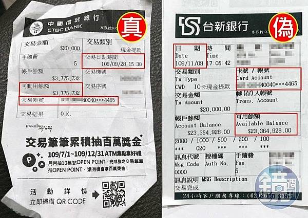 林秉樞找人P圖,竄改ATM領款收據,將帳戶餘額由109年9月28日的3百多萬元(左圖),修改成109年11月9日的2千3百多萬元(右圖),並到處傳給友人炫耀