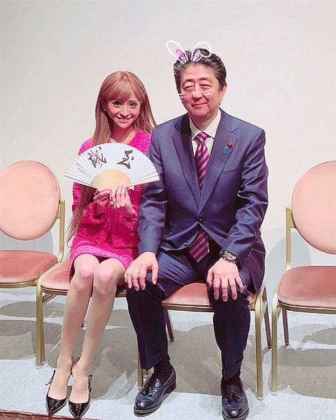 愛澤繪美里在自民黨懇親大會與首相安倍晉三合照