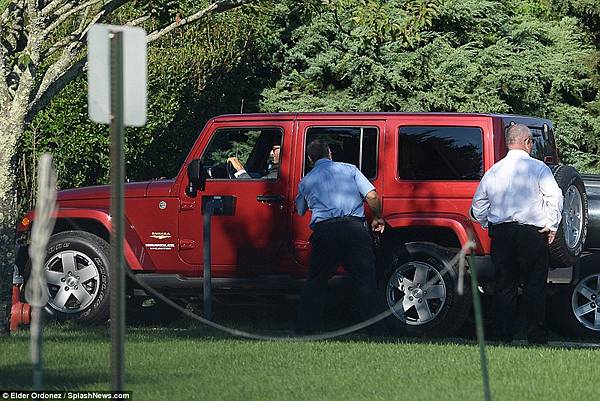 新郎 Brad Falchuk 開著紅色的 Sarah SUV 車輛入場。