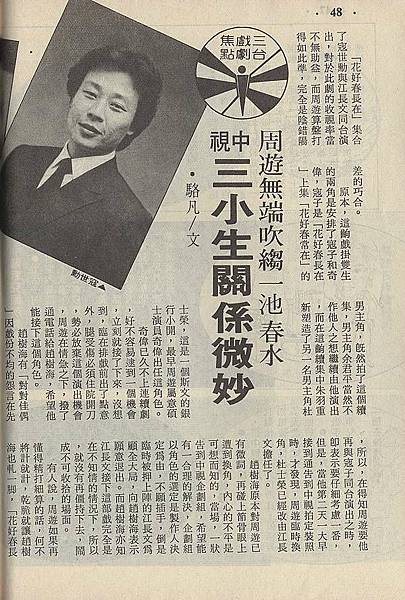 而趙樹海雖然最後沒有得到這部戲演出的機會,可是,他卻因而更看清了自己在中視的地位,畢竟,他有這個機會和江長文「爭」一個角色,多少表示了:他的地位已比一般的新人高出許多。