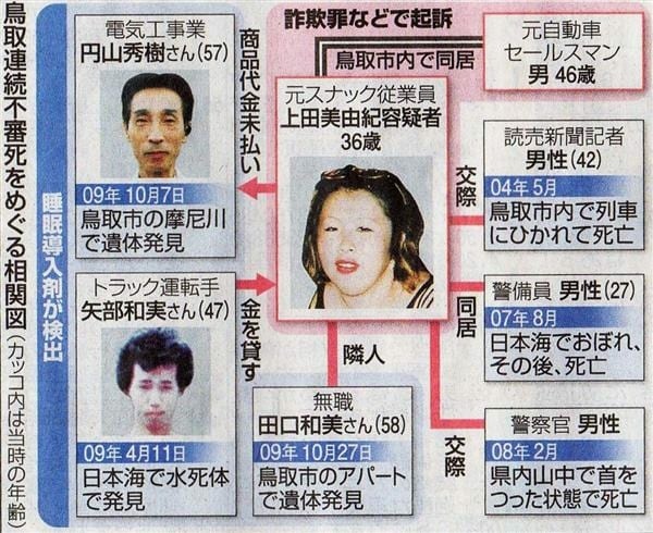起初,上田美由紀並未被懷疑殺人,直到鳥取警方發現不對勁,對2009年的卡車司機、電器行老闆溺死案進行調查,才驚覺兩名死者遭下藥後被推入河中或海中溺斃,員警進一步搜查更發現,上田美由紀涉入另外四件離奇死亡案,但因「當時沒對死者驗屍」,只能依意外或輕生結案,最終法院於2017年宣判「主張沒殺害二人」的上田美由紀死刑。