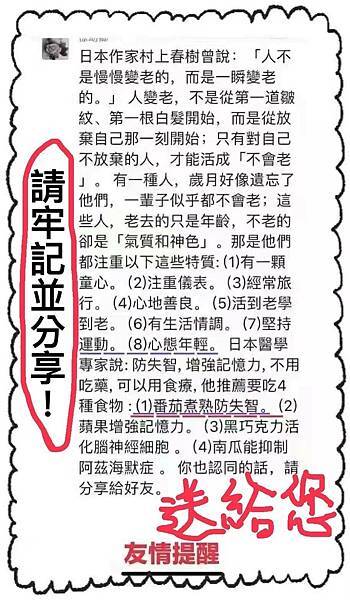 老頭對村上春樹有偏見,認為這號人物是老美「製造」出來的貨色(後附維基百科對他的介紹,仔細推敲就會發現那個味道)。老頭沒看過他的書,一本也沒有(當然有聽過《挪威森林》),所以老頭不敢確定他有沒有談過「人如何變老」這檔事。上文的作者以魚目混珠夾帶私貨的障眼法,抬出這號「美國製的日本貨」來包裝自己的狗屁。然而仔細看只有開頭一句是村上春樹的話,後頭全是他的狗屁。阿芬不會知道村上春樹是啥玩意,但阿芬就信江湖術士們夾帶的那些狗屁,尤其是最後段那些毫無根據的吃什麼「防」什麼。