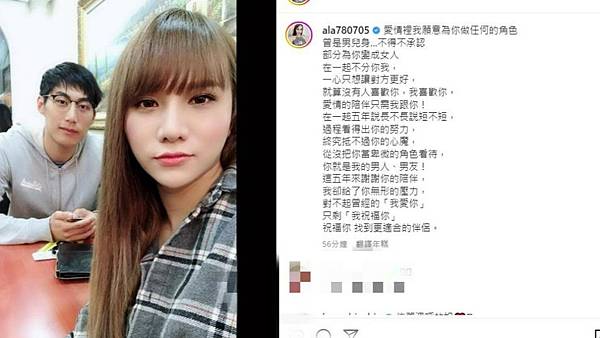 她也提到,交往過程中看的出阿富的心魔與努力,「從沒把你當卑微的角色看待,你就是我的男人、男友!這五年來謝謝你的陪伴,我卻給了你無形的壓力,對不起曾經的『我愛你』只剩『我祝福你』祝福你,找到更適合的伴侶」。