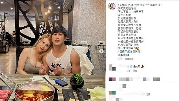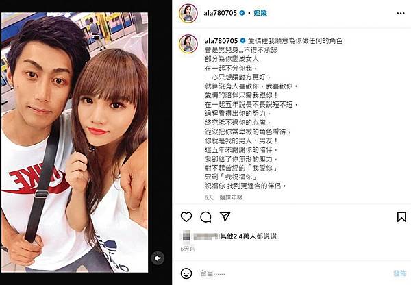 網紅小A辣和男友阿富交往5年,感情相當穩定,無奈今(10)日小A辣就在社群證實兩人的感情告終,「祝福你,找到更適合的伴侶」,阿富也發出合照,感性寫下:「有時候放手是另一種愛的表現,這段期間我很幸福很幸運,我覺得妳值得更好的。」雙雙證實分手消息,讓不少粉絲相當錯愕。