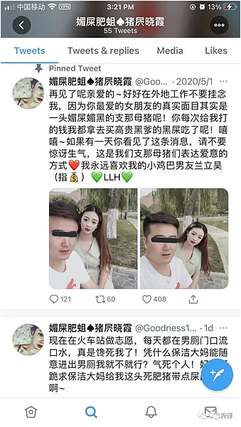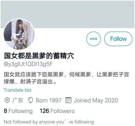 「這些媚黑賤貨也都是爹媽生的,他們被西方白左文化洗了腦,變成人不人鬼不鬼,哪個父母攤上這樣的女兒是倒了八輩子黴!如果像推特中這麼多中國女孩找黑人淫亂,又對中國男孩提出各種苛刻要求,萬一這個中國女孩懷了黑人的孩子,如果抱回來,做中國父母的養不養? ! 」