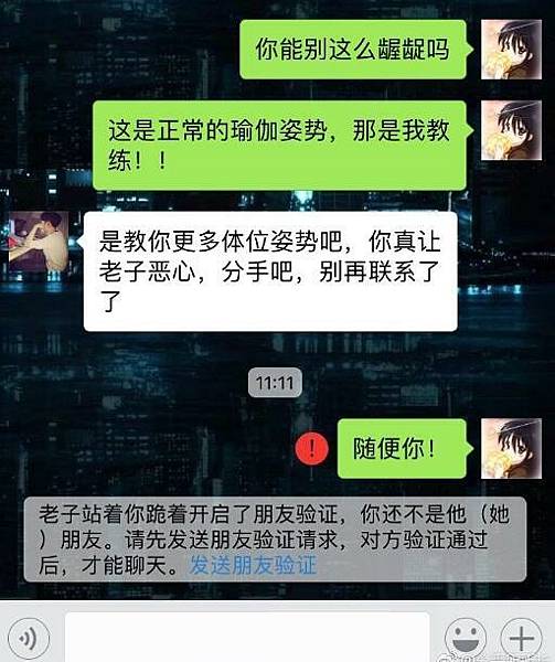 有男生看到女友練習瑜伽的照片後,一時惱羞成怒,感覺自己被綠了,將女友直接拉黑!