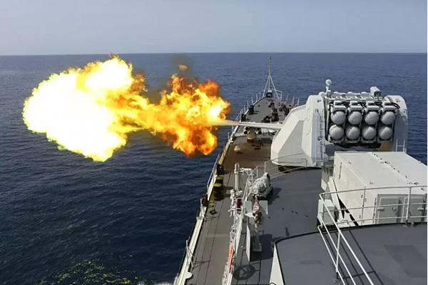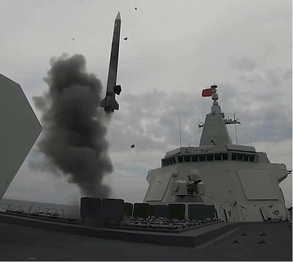 055型導彈驅逐艦首艦南昌號(101)艦首垂直發射器發射海紅旗-9防空飛彈(冷射)