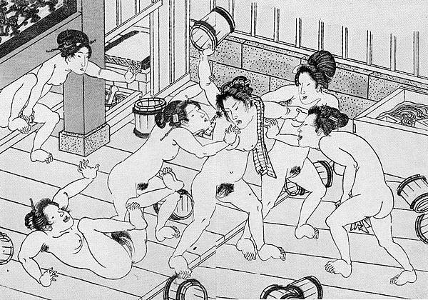 接下來要舉出幾個將裸體視為日常用品的極端例子。首先,是歌川國貞所畫的《女湯吵架圖》,畫中可見幾名露出陰部的女性,包括揮舞水盆作勢要打人的女性、勸架的女性、折回洗浴場的女性,以及從石榴口跑出來的女性等,畫中描繪女性吵架的景象,只能用慘烈來形容,完全感受不到任何色情含意。在看到這些女性的裸體時,會有男性產生情慾嗎?我想應該會想要撇開視線,至少不會一直盯著看吧!這就是裸體成為日常化的象徵性表現。