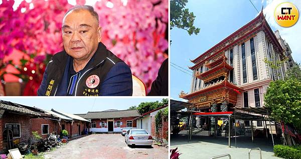 吳寶田(左上),彰化秀水下崙村老家三合院(左下),五股賀聖宮(圖右)
